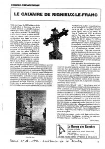 A cette époque cette croix se trouvait près de la forge (actuellement maison de Mme et Mr CHAMBAUD). Son emplacement devenant gênant, elle fût déplacée en 1876 après un échange de terrain avec Mr François Xavier JEANPETIT épicier à Rignieux Le Franc. Mais déjà, des voix se faisaient entendre pour la transporter vers l’église ; ce fut sans succès.