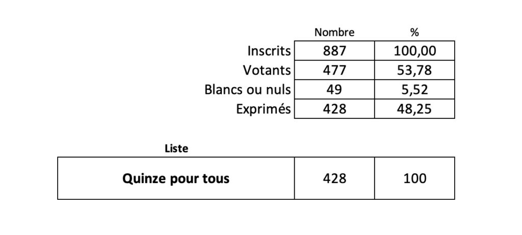 Retrouvez ci-dessous les chiffres obtenus par la seule liste en lice pour ce premier tour.