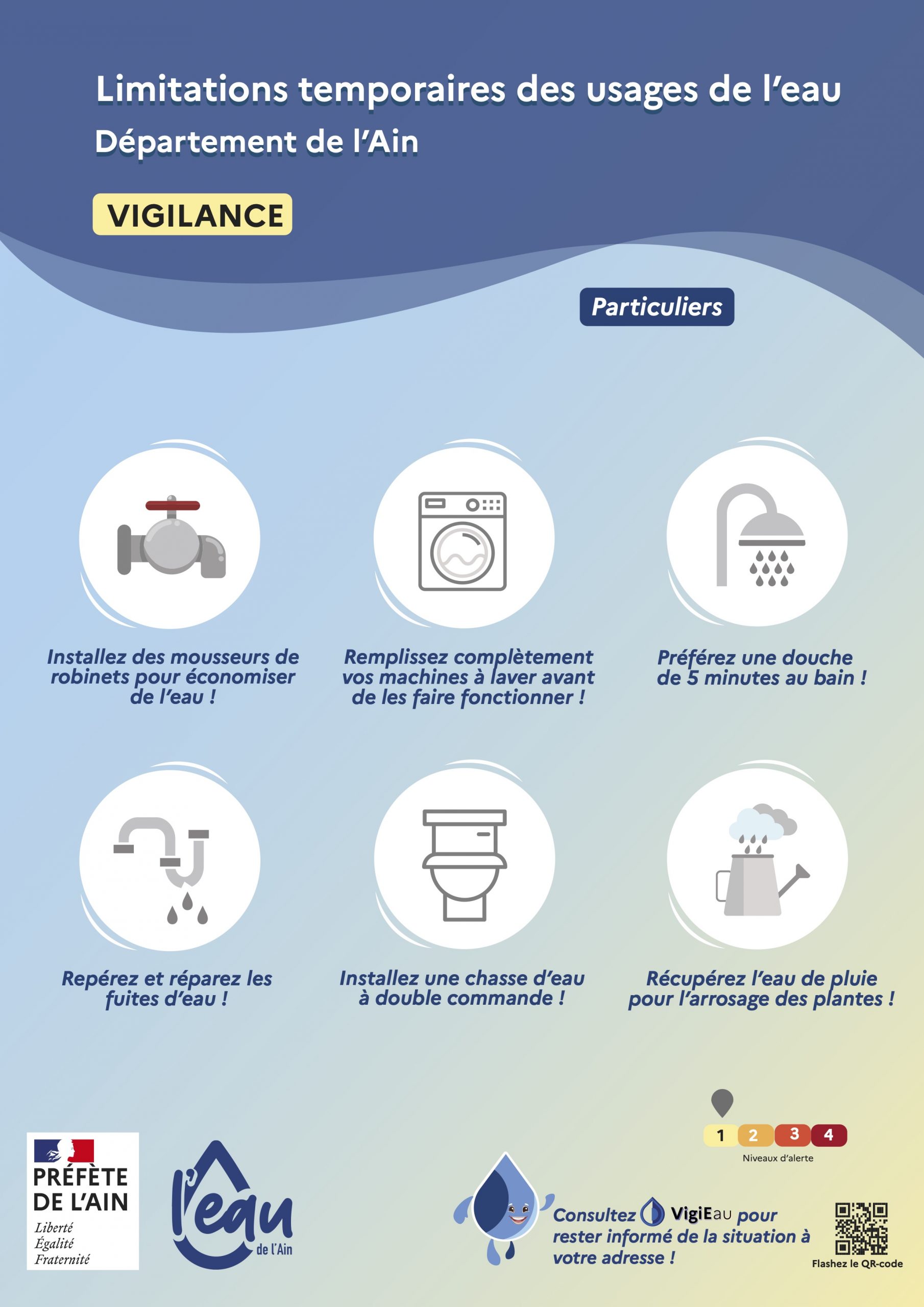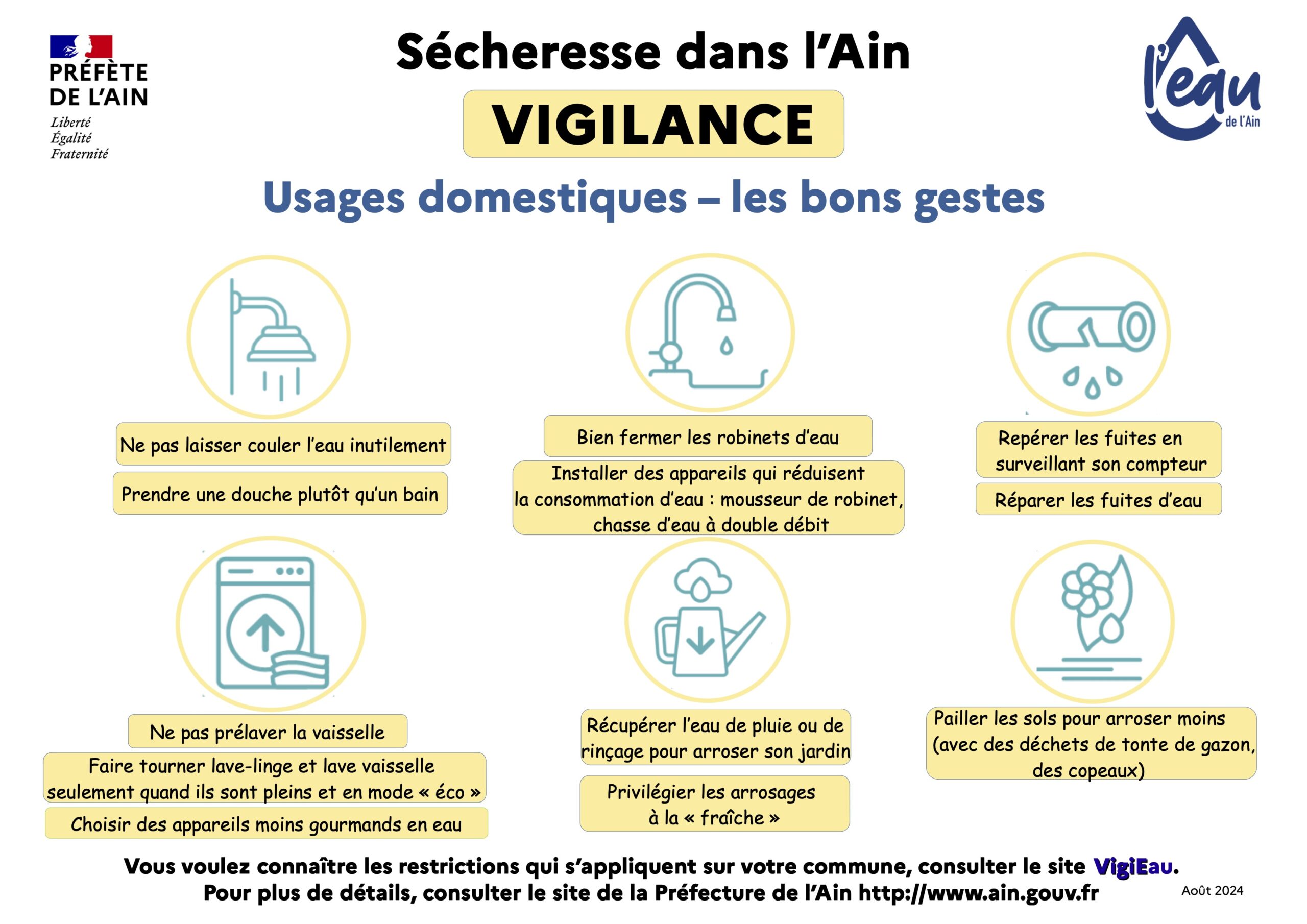 En conséquence, Mme le Préfet de l’Ain a pris un arrêté qui porte notre commune à l’état de Vigilance Sécheresse.